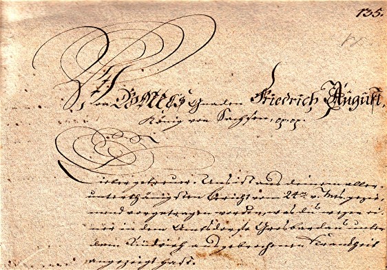 Von GOTTES Gnaden Friedrich August,/ König von Sachsen p. p./ Lieber getreuer. Uns ist aus deinem aller-/ unterthänigsten Bericht vom 24ten v. Mts. gezie-/ mend vorgetragen worden, was du wegen ei-/ ner in dem Amtsdorfe Grosbardau unter/ dem Rindvieh ausgebrochenen Krankheit/ angezeigt hast./ Nachdem nun diese, dermalen in meh-/ rern Districten Unserer Lande herrschende/ und unter dem Namen der Maul- und Klau-/ enseuche bekannte Viehkrankheit auf/ Unsere Anordnung, durch den hiesigen/ Oberthier-Arzt Reutter an Orten, wo/ sie vorhanden gewesen, untersucht/ worden ist; So lassen Wir dir beyge-/ hend einen Extract der von selbigem/ hierauf über die Entstehungsursachen/ sothaner Krankheit, so wir über die/ dabei anzuwendenden präservativen/ und curativen Mittel erstatteten gut-/ achtlichen Anzeigen mit dem Begehren//