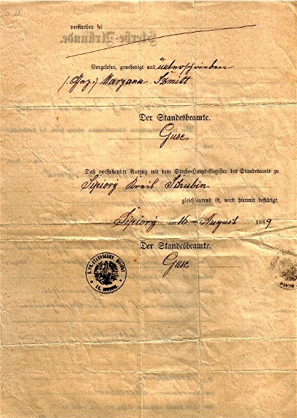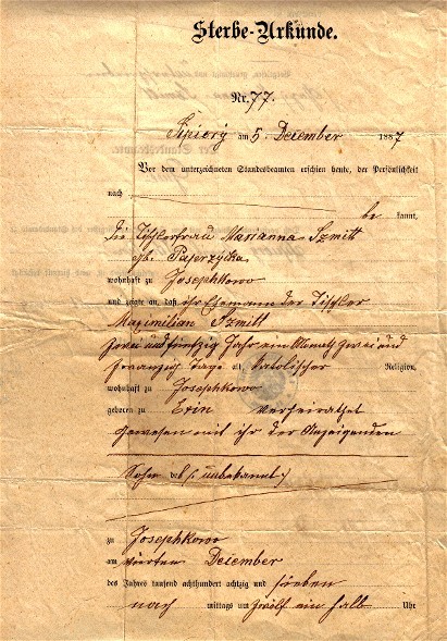 Sterbe-Urkunde./ Nr. 77./ Sipiory am 5. December 1887/ Vor dem unterzeichneten Standesbeamten erschien Heute, der Persönlichkeit/ nach bekannt/ die Tischlerfrau Marianna Szmitt/ geb. Paprzycka/ wohnhaft zu Josephkowo/ und zeigte an, daß ihr Ehemann der Tischler/ Maximilian Szmitt/ zwei und fünfzig Jahr ein Monath zwei und/ zwanzig Tage alt, katolischer Religion,/ wohnhaft zu Josephkowo/ geboren zu Erin verheirathet/ gewesen mit ihr der Anzeigenden/ Sohn des (unbekannt) zu Josephkowo/ am vierten December des Jahres tausend achthundert achtzig und sieben/ nachmittags um zwölf ein halb Uhr// verstorben sei/ Vorgelesen, genehmigt und unterschrieben/ (Gez.) Margana Szmitt/ Der Standesbeamte. Guse/ Daß vorstehender Auszug mit dem Sterbe-Haupt-Register des Standesamtes zu/ Sipiory Kreis Schubin/ gleichlautend ist, wird hiermit bestätigt./ Sipiory am 16 ten August 1889 Der Standesbeamte. Guse// [Stempel: K.PR.STANDESAMT SIPIORY; KR. SCHUBIN]